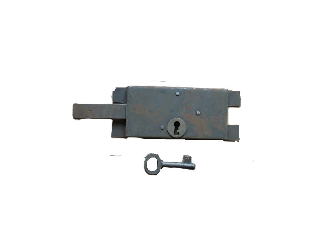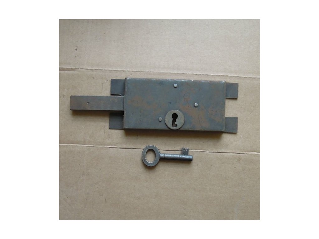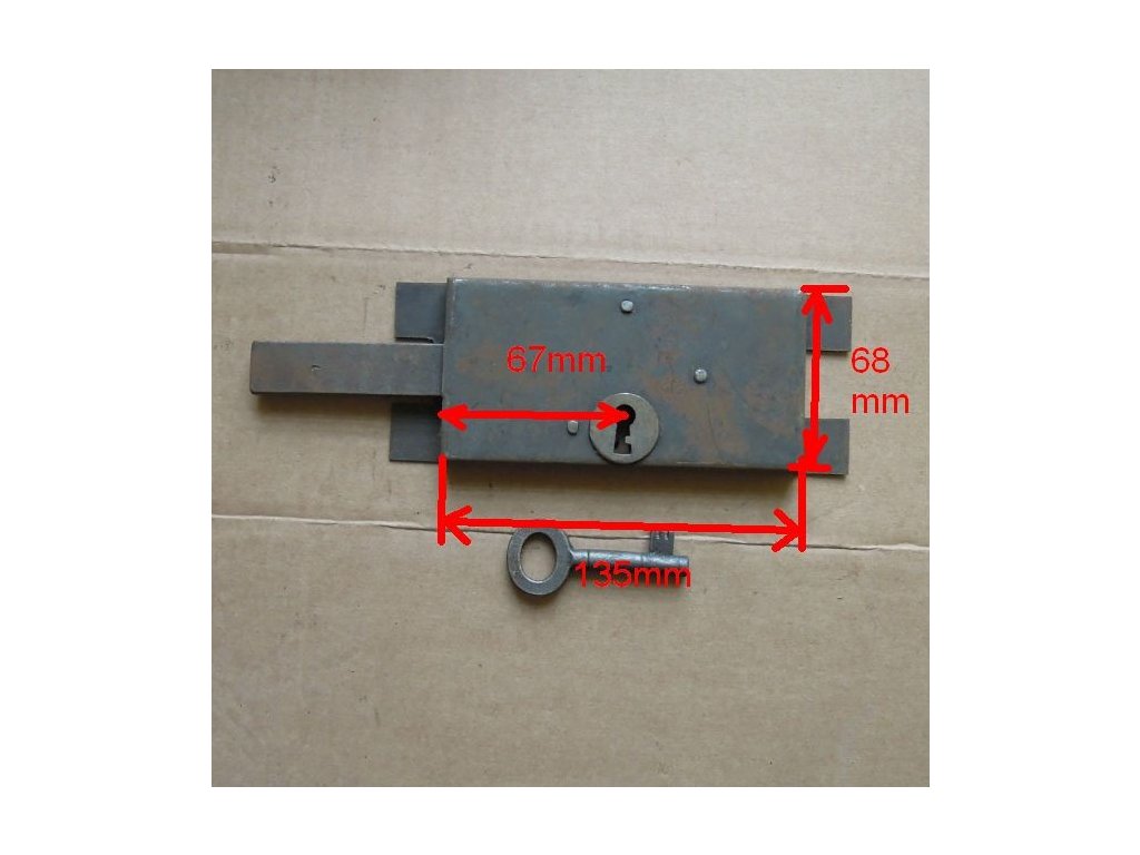 antikový zámek na dveře s klíčem, nečiątěno, orezlé, rozměry viz foto, vhodný na industriální skříně