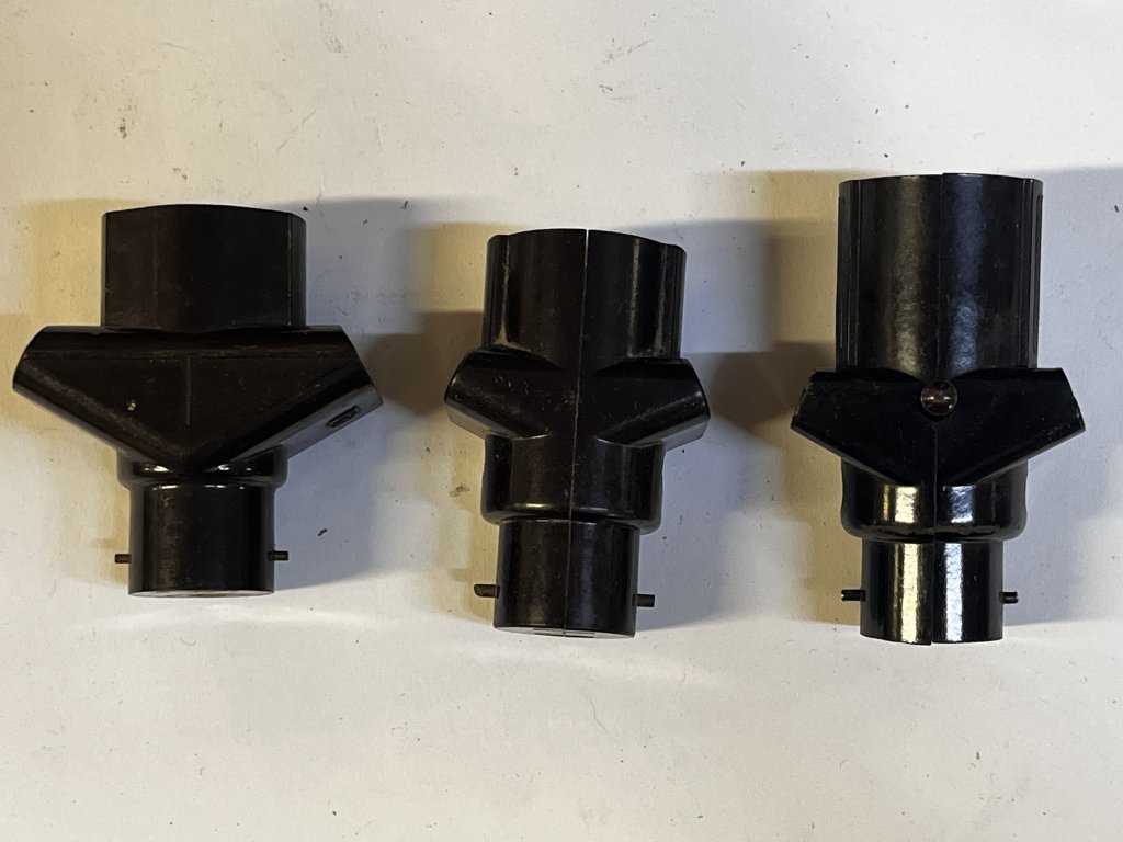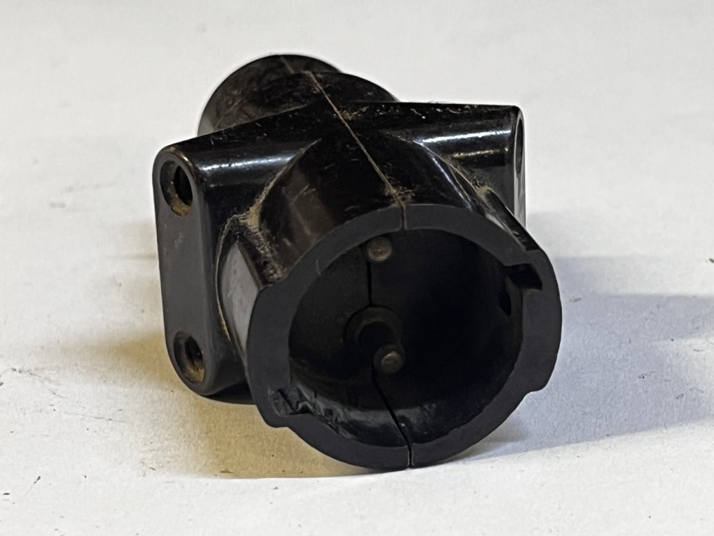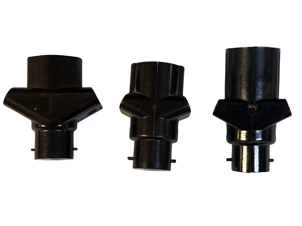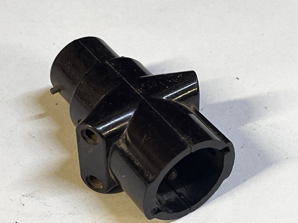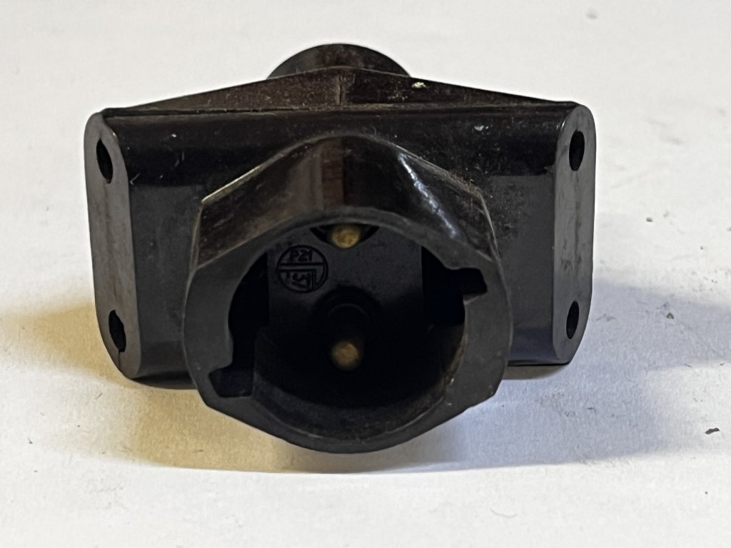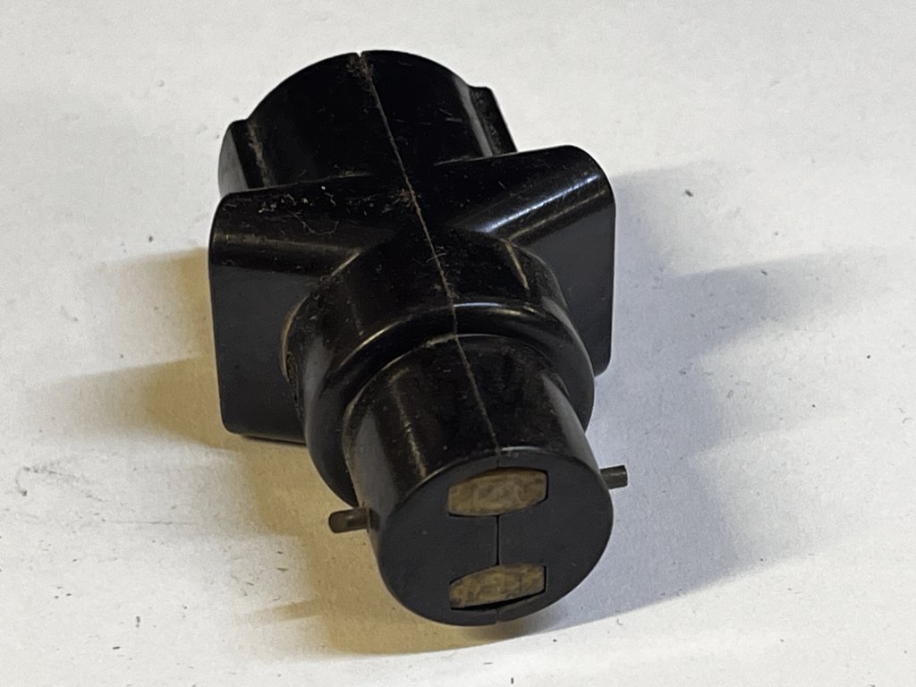 Bakelitová rozbočka typu „T“ pro připojení více spotřebičů do jedné zásuvky. Výroba přibližně 1940–1960. Určena k doplnění dobových elektroinstalací nebo jako sběratelský kousek.