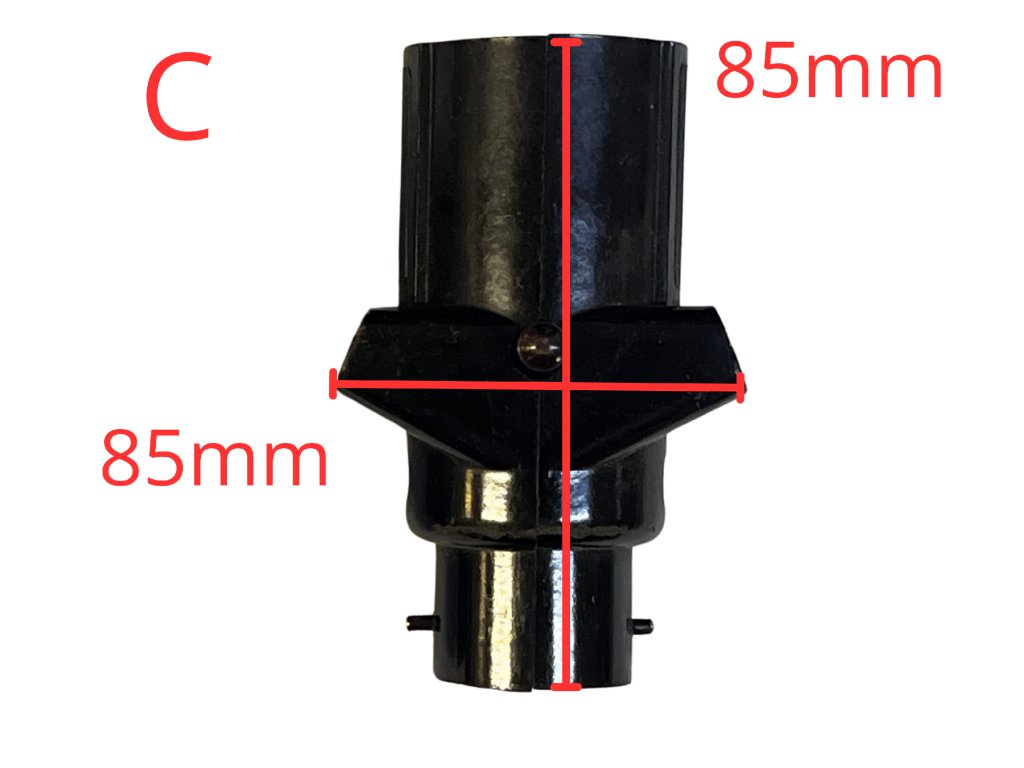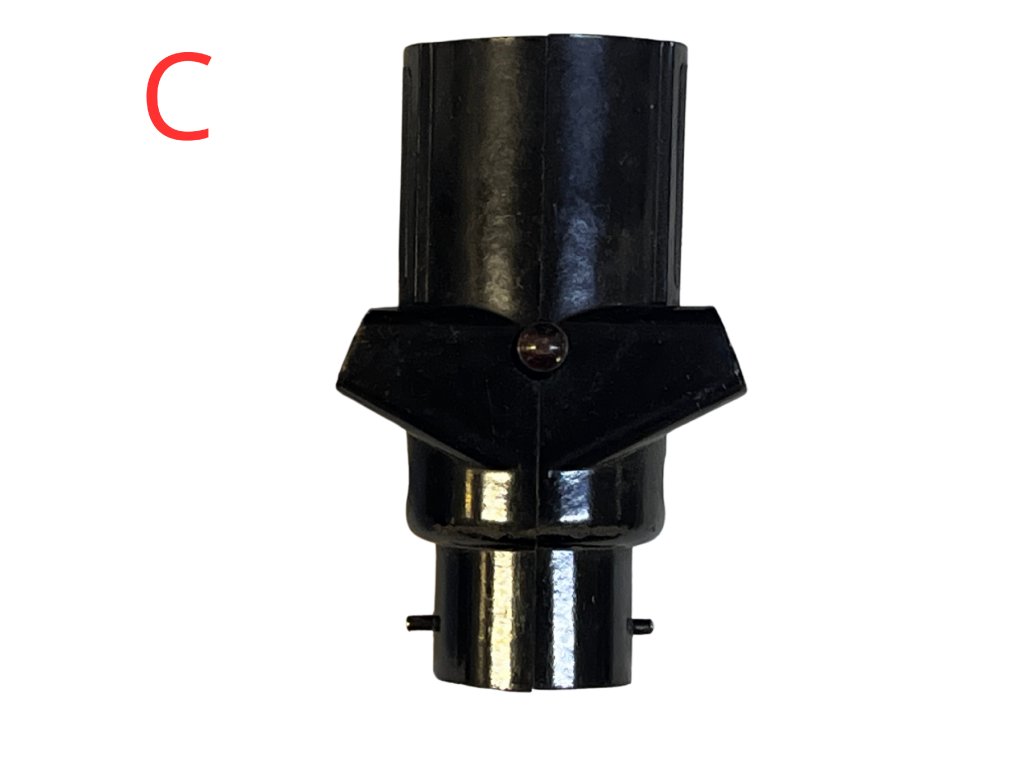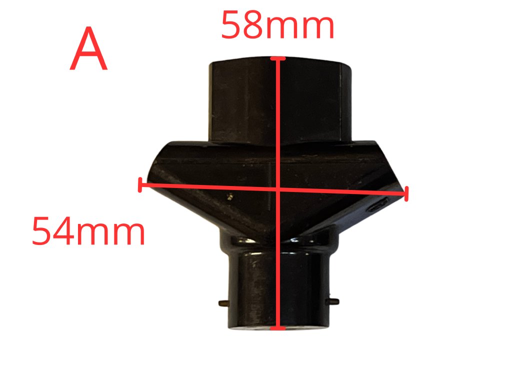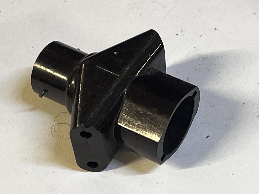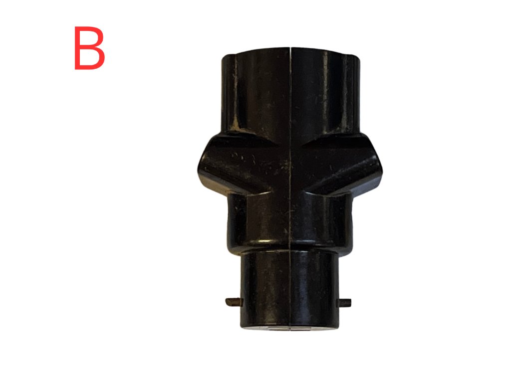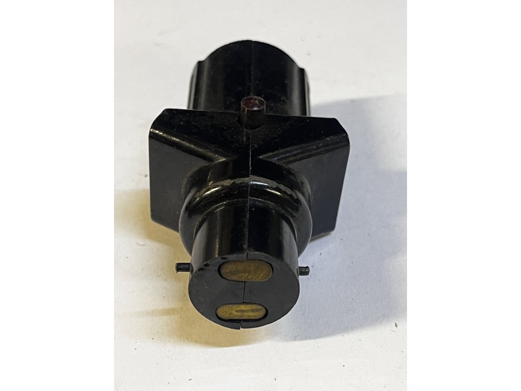 Bakelitová rozbočka typu „T“ pro připojení více spotřebičů do jedné zásuvky. Výroba přibližně 1940–1960. Určena k doplnění dobových elektroinstalací nebo jako sběratelský kousek.
