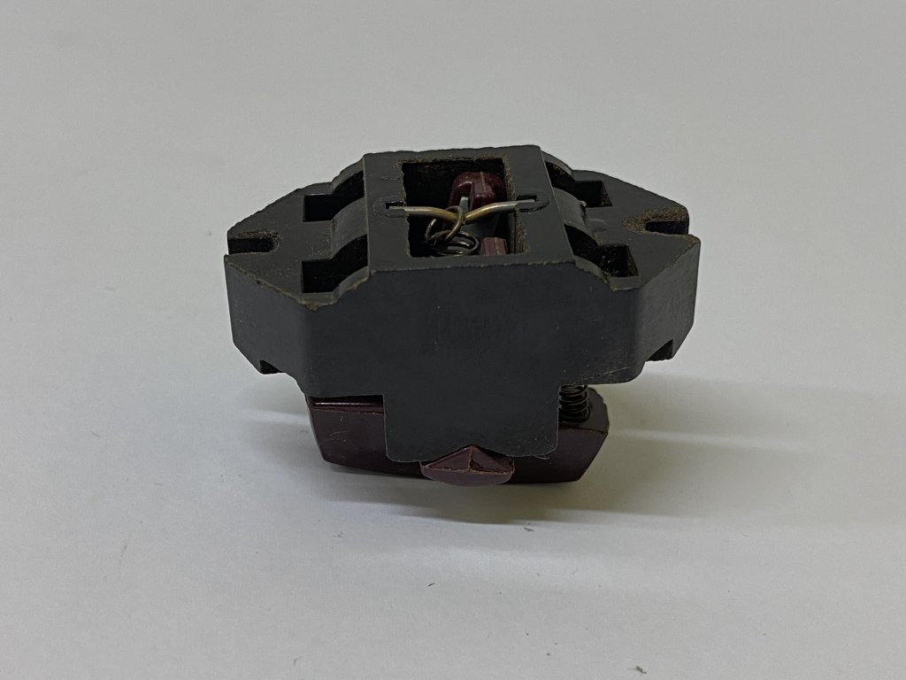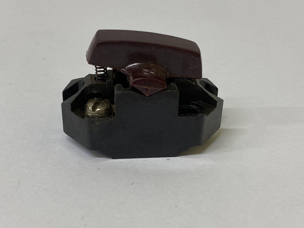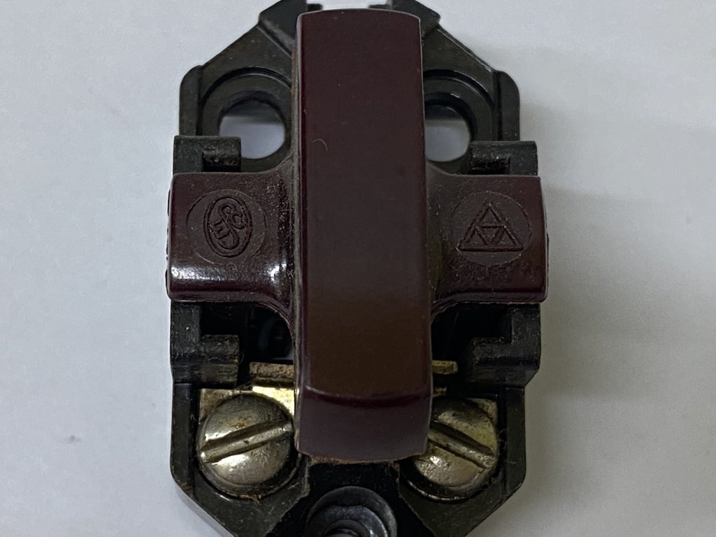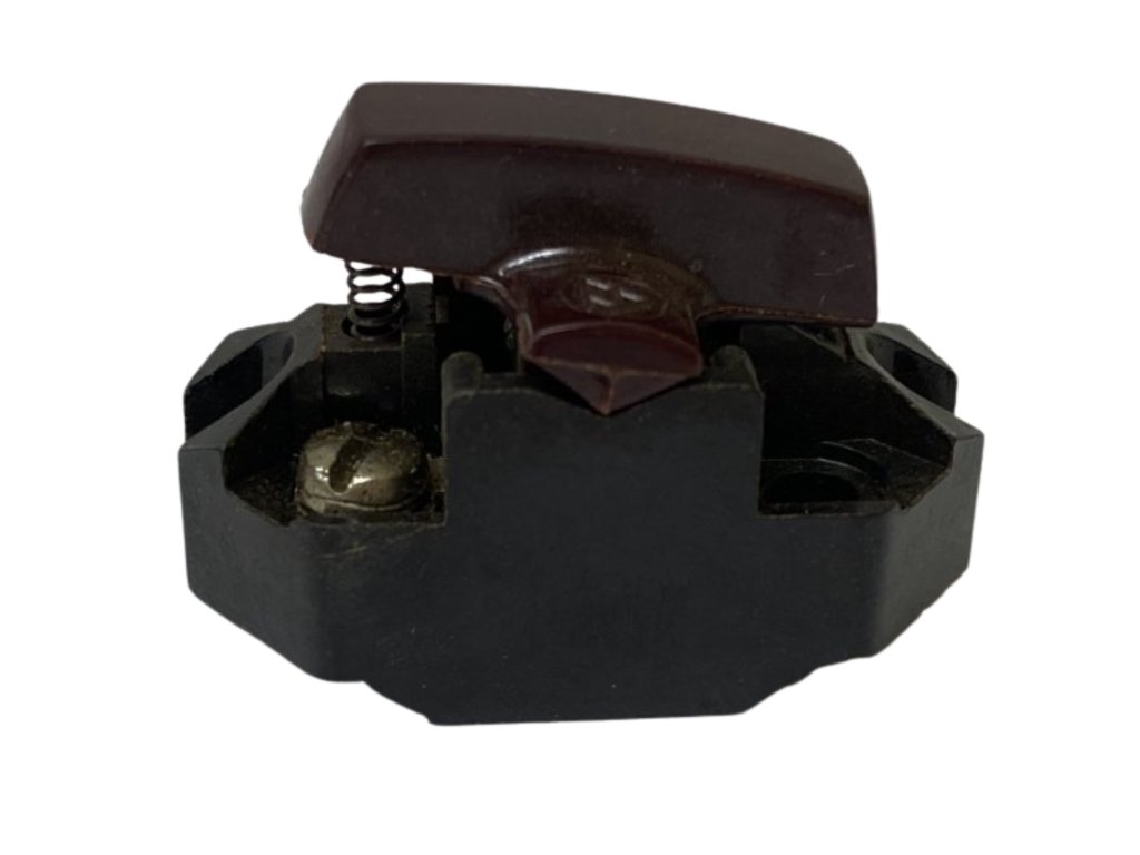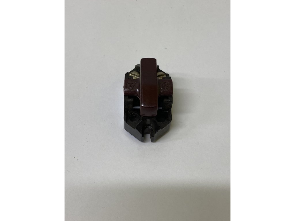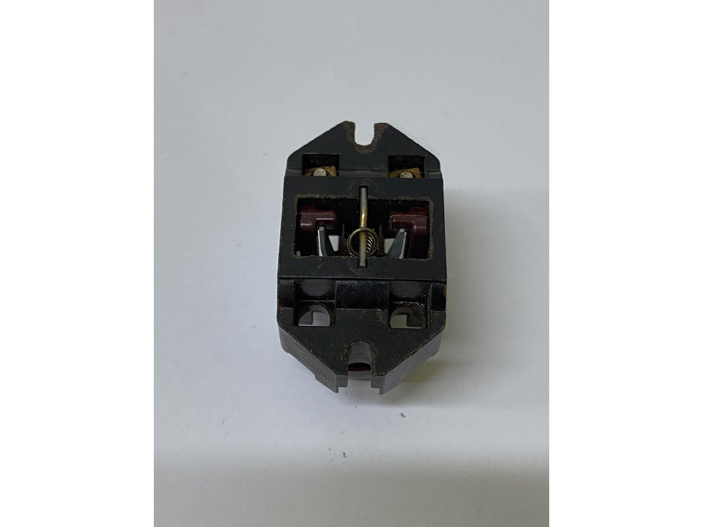 Starý bakelitový spínač s kolébkou, který lze stlačit pouze na jednu stranu. Pružinový mechanismus zajišťuje návrat do výchozí polohy, takže je určen pro krátkodobé sepnutí obvodu, například k ovládání spotřebiče, stroje nebo jako startovací tlačítko. Robustní provedení s mosaznými kontakty, povrch v kombinaci černého bakelitu a hnědé páčky.