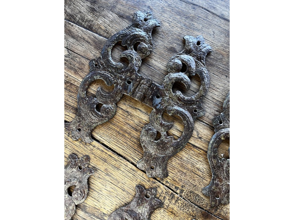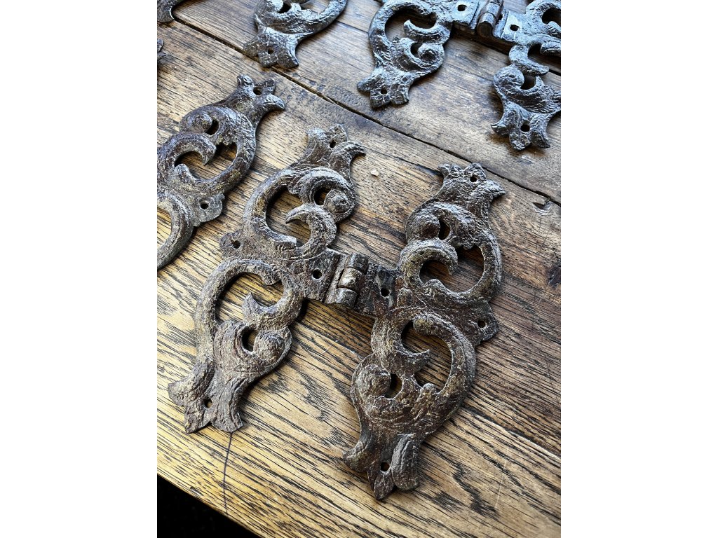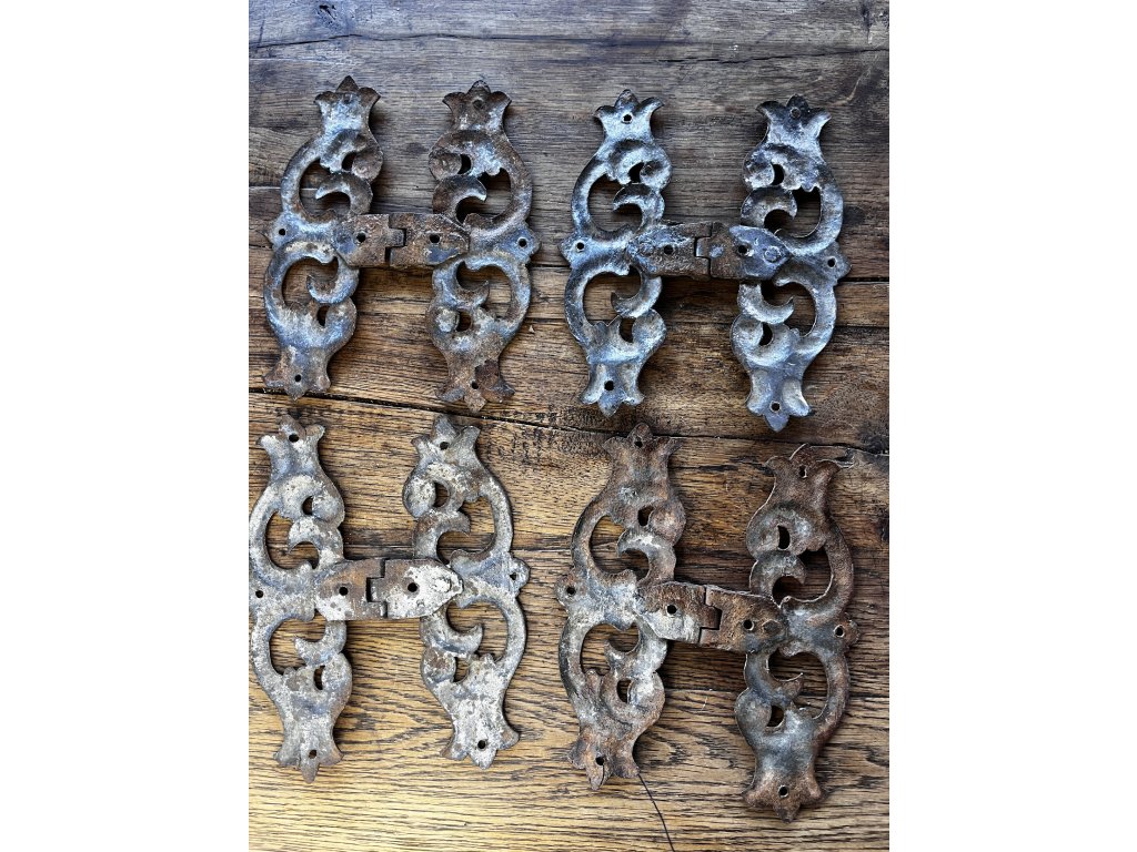 Sada čtyř barokních dveřních pantů s bohatě tvarovanými křídly a dekorativními průřezy, vhodných pro historické dveře