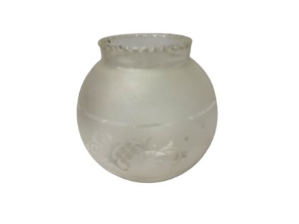 Kulovité skleněné stínidlo pro petrolejovou lampu z matného skla s jemně leptaným ornamentálním dekorem v pásu kolem obvodu a vlnkovaným okrajem. Sklo je čiré v...