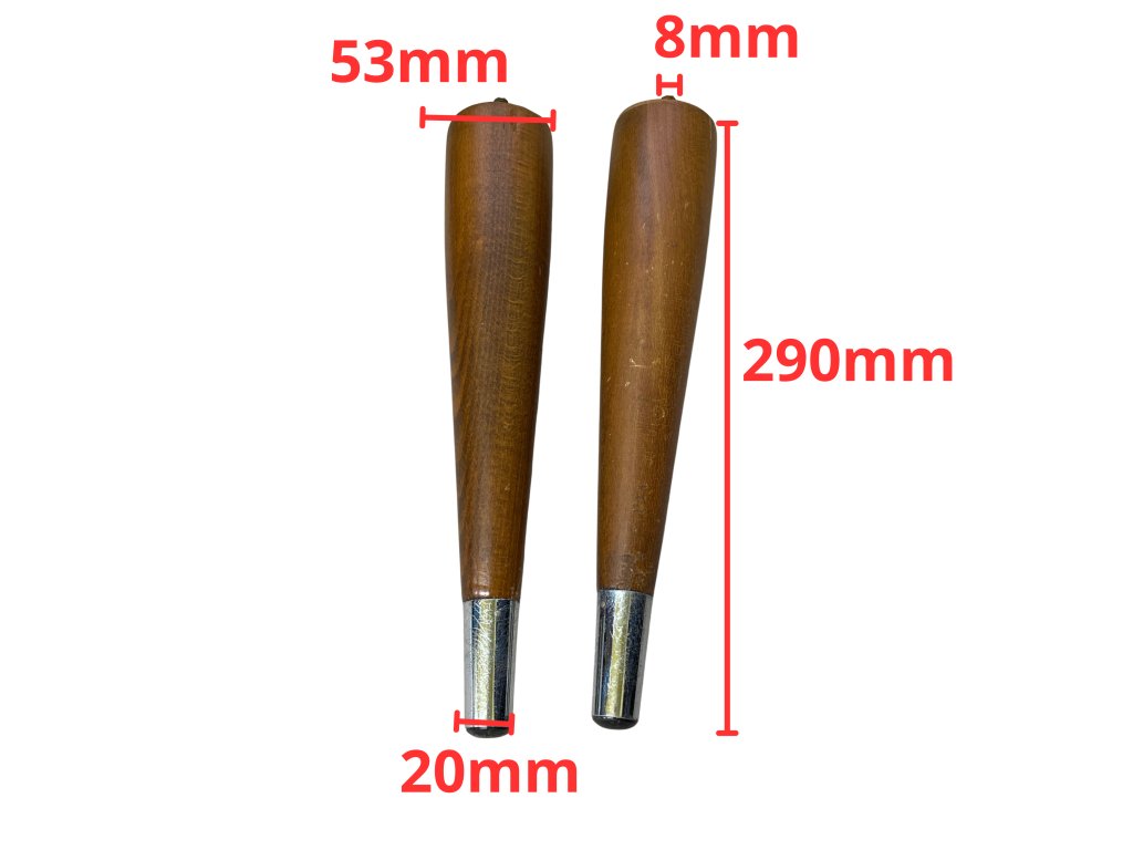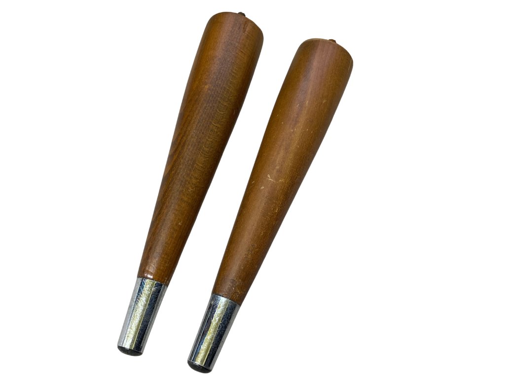 Dřevěné nohy k nábytku se šroubovacím zakončením a kovovým koncem. Kuželovitě tvarované, z lakovaného dřeva s jemnou patinou, spodní část opatřena kovovou objímkou a gumovou koncovkou. Vhodné jako náhradní nohy pro retro stolky, komody nebo křesla z poloviny 20. století.