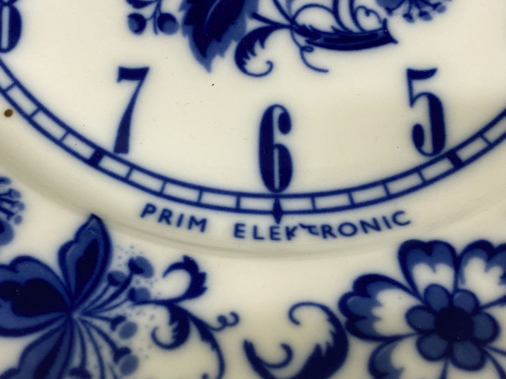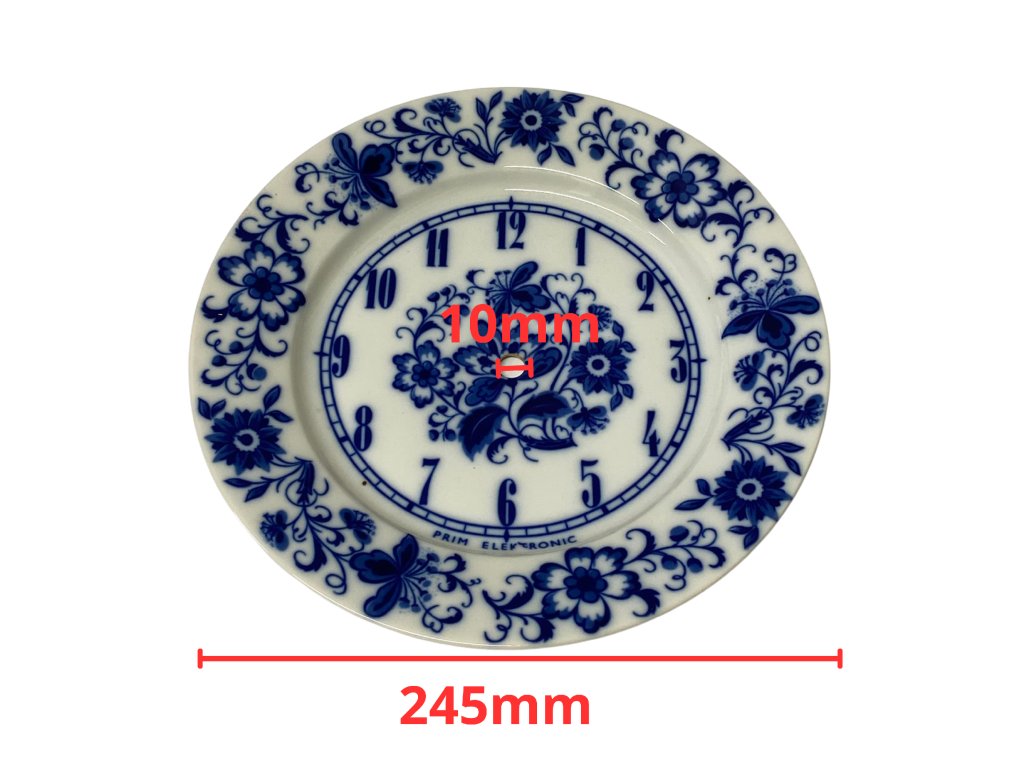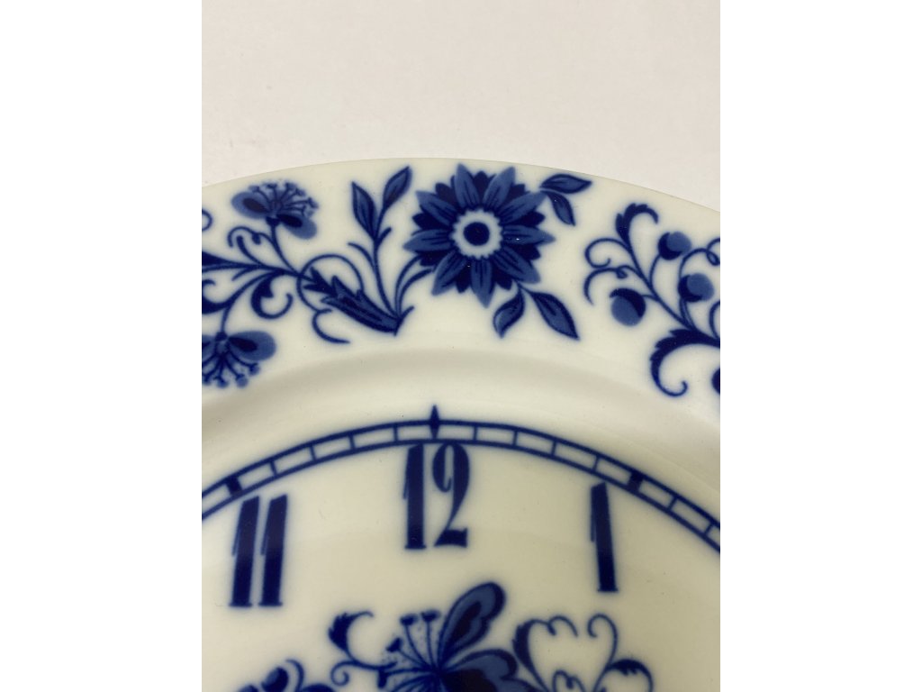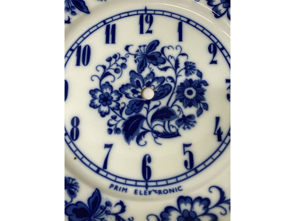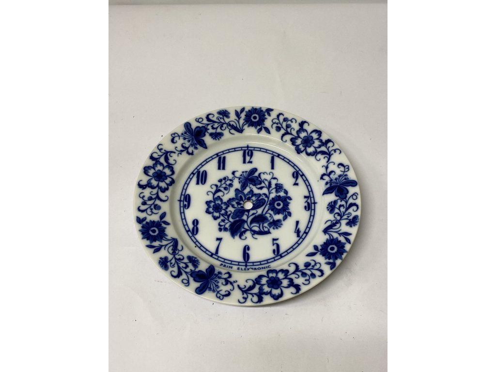 porcelánový ciferník (nebo dekorativní talíř) určený pro nástěnné hodiny značky PRIM Electronic. Ciferník nese ikonický a velmi oblíbený modrobílý vzor Cibulák (Zwiebelmuster). Jedná se o typický retro kousek z období Československa, přibližně ze 70. nebo 80. let 20. století.