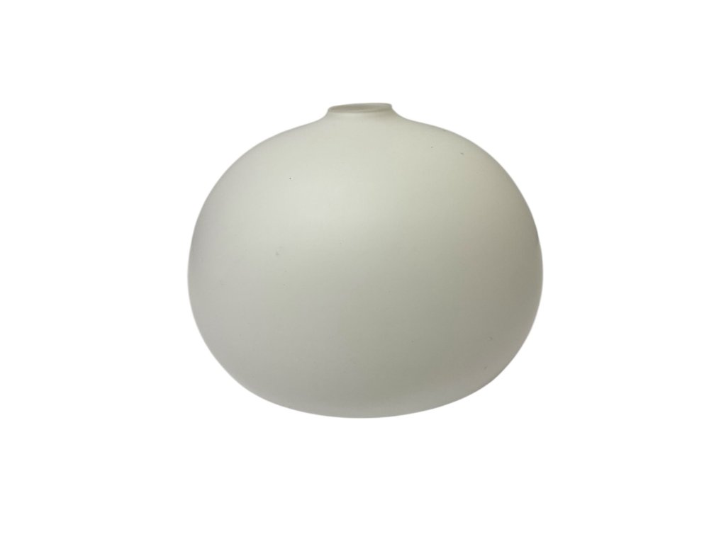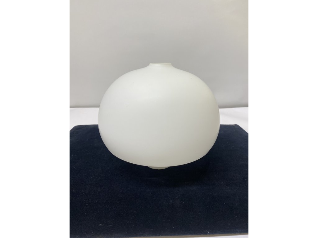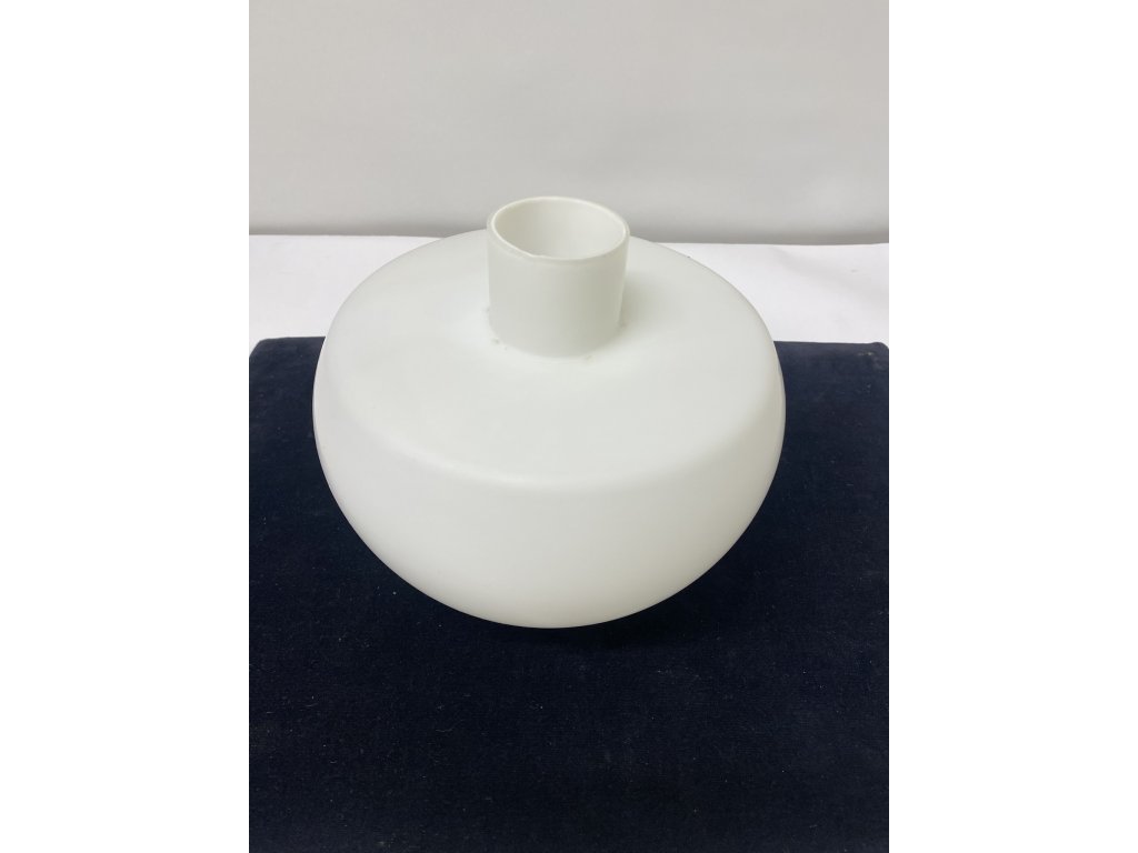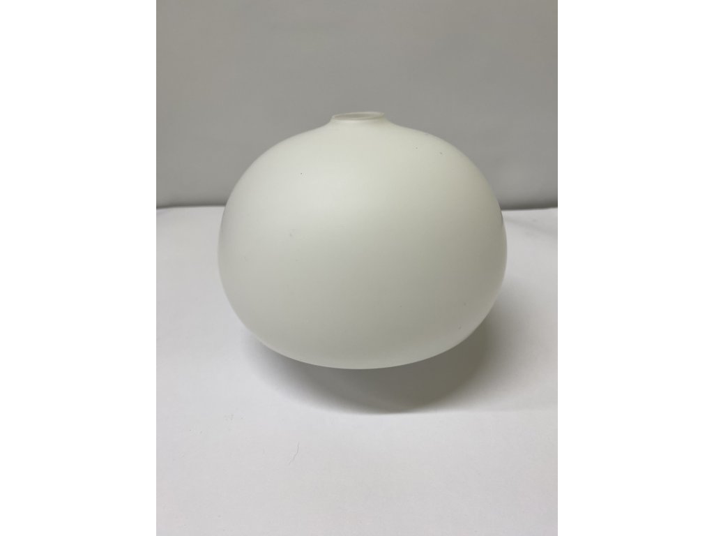 Kulovité stínidlo z mléčně bílého opálového skla s hladkým povrchem a úzkým hrdlem ,výrobce Osvětlovací sklo Kamenický Šenov . Povrch matný, světlo rozptyluje rovnoměrně a vytváří měkký, neoslňující efekt.