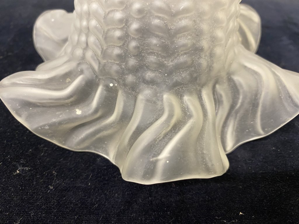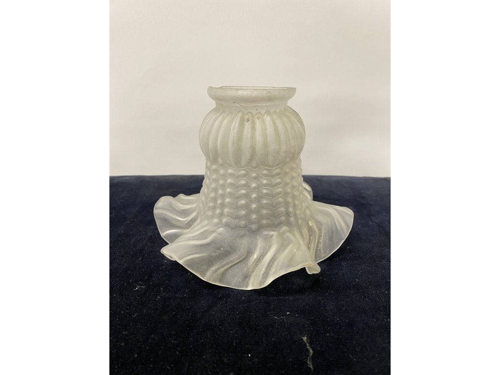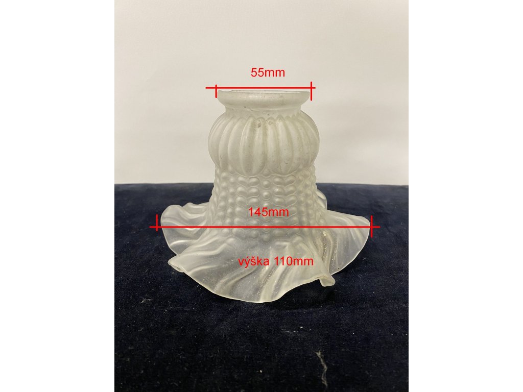 Antikové skleněné stínidlo z matného skla s jemně zvlněným okrajem a plastickým dekorem . Horní část má žebrovanou strukturu a úzký otvor pro uchycení. Jednotlivé kusy se mohou mírně lišit, rozměr viz. foto