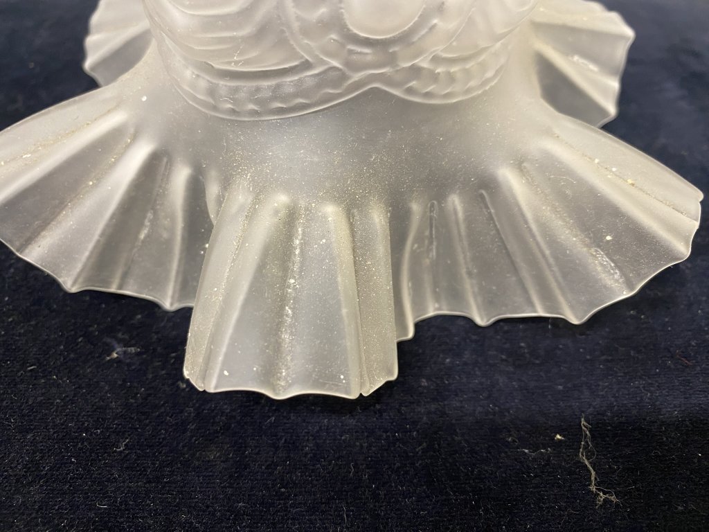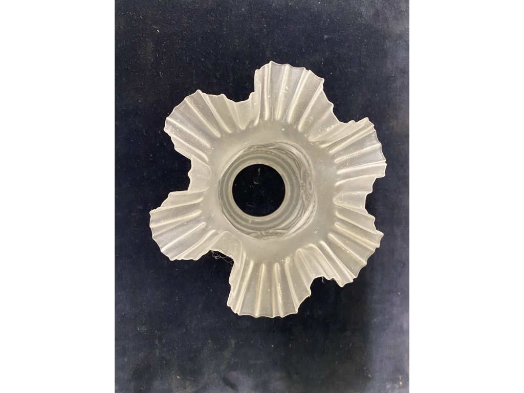 Antikové skleněné stínidlo z matného skla s bohatě plastickým dekorem v podobě girland a oválných medailonů. Spodní část je zakončena zvlněným okrajem s rytým žebrováním. Jednotlivé kusy se mohou mírně lišit, rozměr viz. foto