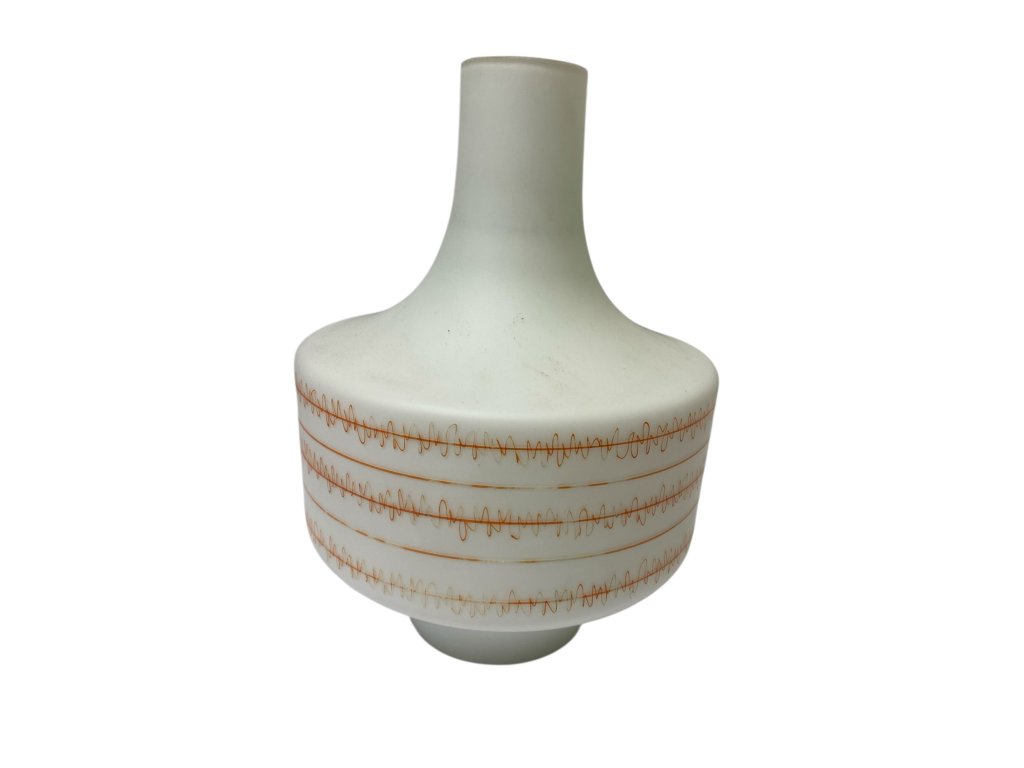 Stínidlo z mléčně bílého opálového skla s úzkým hrdlem, zdobené oranžovými linkami s vlnkovým vzorem po obvodu. Povrch je matný, s drobnými stopami používání. Vhodné pro zavěšení na stropní nebo nástěnné svítidlo v retro stylu, typicky ze 60.–70. let 20. století.