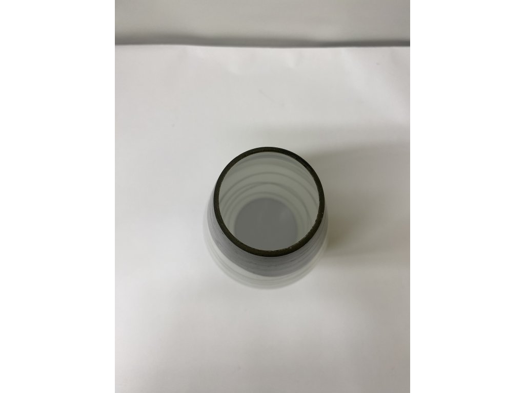 Skleněné stínidlo kuželovitého tvaru z bílého opálového skla s přechodem do černé barvy v horní části. Povrch je zdoben jemnými nepravidelnými linkami vinoucími se po obvodu.Rozměr viz. foto